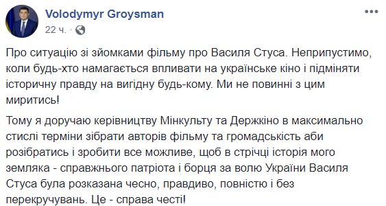 Несмотря на эти объяснения, в соцсетях вспыхнул скандал. После чего власти намекнули, что скандальную сцену в фильм вернут. Такой вывод можно сделать из поста на Facebook премьер-министра Владимира Гройсмана.