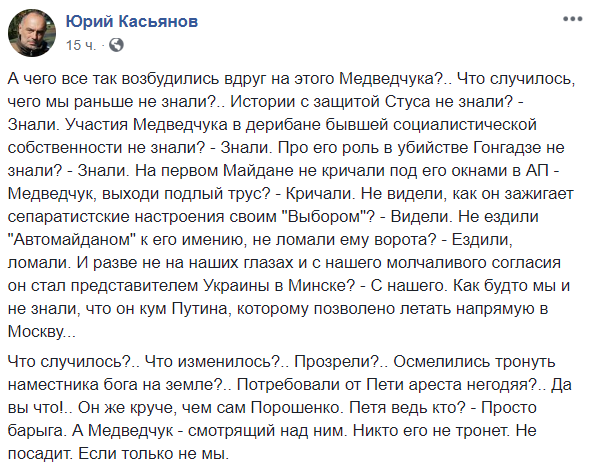 Что случилось?.. Что изменилось?.. Прозрели?.. Осмелились тронуть наместника бога на земле?.. Потребовали от Пети ареста негодяя?.. Да вы что!.. Он же круче, чем сам Порошенко. Петя ведь кто? – Просто барыга. А Медведчук – смотрящий над ним", – пишет волонтер Юрий Касьянов.