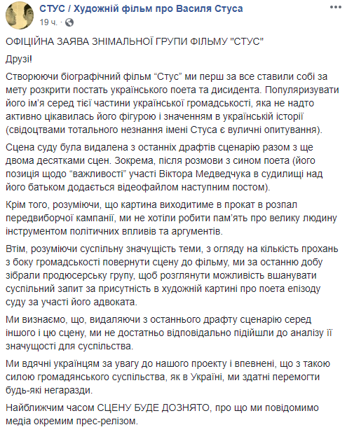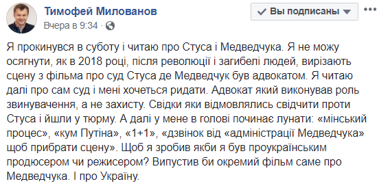 "Я проснулся в субботу и читаю о Стусе и Медведчуке. Я не могу понять, как в 2018 году, после революции и гибели людей, вырезают сцену из фильма о суде Стуса,где Медведчук был адвокатом. Я читаю дальше о самом суде, и мне хочется рыдать. Адвокат, который выполнял роль обвинения, а не защиты.