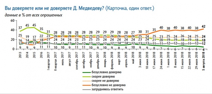 На вопрос "Вы доверяете или не доверяете В. Путину?" вариант ответа "безусловно доверяю" в августе выбрало только 24% опрошенных, тогда как в марте этого года таких было 43%.