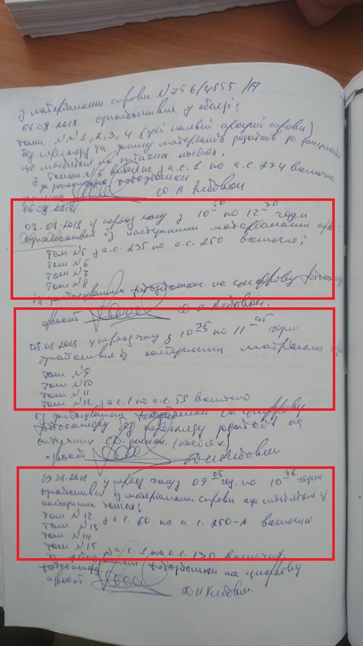 На фото видно, что недавно назначенный адвокат Центра правовой помощи Юрий Рябовол начал знакомиться с материалами дела, о чем делает записи в специальном журнале. Согласно этим записям, защитник успевает за час-полтора ознакомиться сразу с четырьмя томами дела. Как уточняет источник, который участвует в этом процессе, каждый том - это 200-250 страниц.