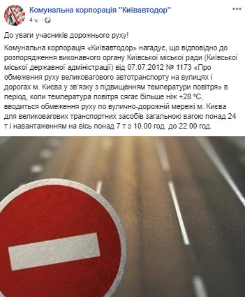 "Коммунальная корпорация "Киевавтодор" напоминает: в период, когда температура воздуха достигает более +28ºС, в столице с 10:00 до 22:00 вводится ограничение движения для тяжеловесных транспортных средств общим весом свыше 24 тонны и нагрузкой на ось более 7 тонн", - сообщается на странице Киевской горгосадминистрации в соцсети. Данное ограничение введено соответствующим распоряжением КГГА от 7 июля 2012 года.
