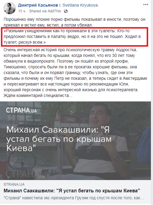 Любопытно, что из всего интервью с бывшим президентом Грузии и губернатором Одесской области блогеров, лояльных к президенту, зацепило именно это откровение Саакашвили - про походы в туалет.