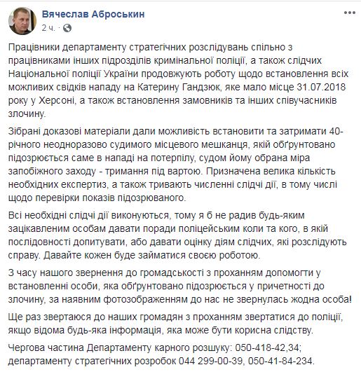 Николай Новиков, который заявил о своем алиби в момент нападения на советницу мэра Херсона Екатерину Гандзюк, "обоснованно подозревается", а свидетели, которые могут подтвердить его невиновность, пусть официально обращаются в полицию. Об этом сообщает в Facebook первый заместитель главы Нацполиции Вячеслав Аброськин.