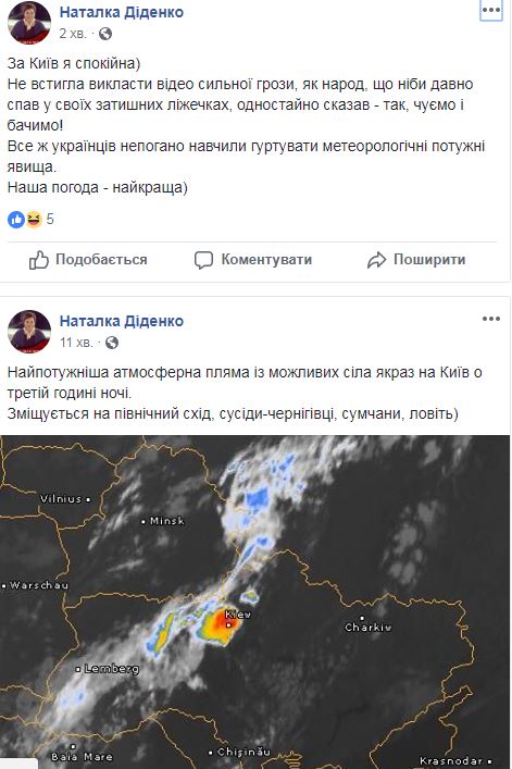 Около 3:00 в ночь с 15 на 16 августа на Киев обрушились дожди, град и мощнейшие грозы. Небывалые масштабы стихии оторвали среди ночи от уютных кроватей огромное количество жителей города, принявшихся закрывать окна и спасать сушившееся белье.