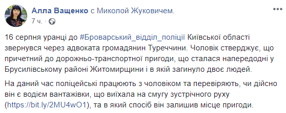 По словам начальника пресс-службы Главного управления Нацполиции в Житомирской области Аллы Ващенко, правоохранители проверяют, действительно ли этот мужчина является водителем грузовика, который совершил смертельное ДТП и скрылся с места происшествия.