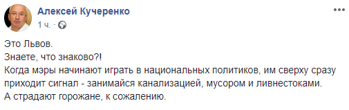 "Знаете, что знаково?! Когда мэры начинают играть в национальных политиков, им сверху приходит сигнал - занимайся канализацией, мусором и ливнестоками. А страдают горожане, к сожалению", - отметил Кучеренко.