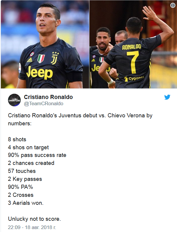 Роналду в своем Twitter опубликовал итоги своего дебюта за новый клуб.