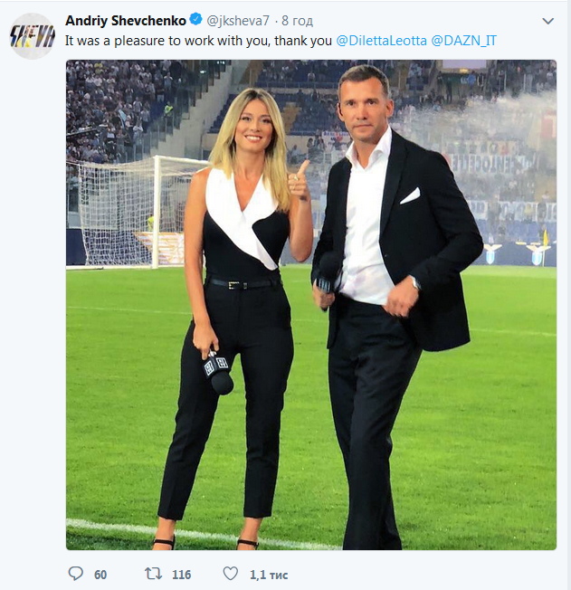 Наш коуч подписал контракт с телеканалом "DAZN Italia" и теперь работает телеэкспертом по Серии А. Дебют Шеченко состоялся на матче Лацио - Наполи (который выиграли гости со счетом 1 - 2 - Прим.Ред.). Примечательно, что работал Андрей Шевченко в паре с невероятно роскошной блондинкой, журналисткой канала Дилетта Леоттой (Diletta Leotta).
