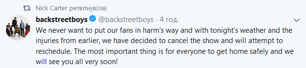 "Мы никогда не хотели, чтоб пострадали наши фанаты. Мы решили отменить концерт и постараемся его перенести. Главное, чтобы все добрались благополучно домой. Скоро увидимся!" - написал Ник Картер.
