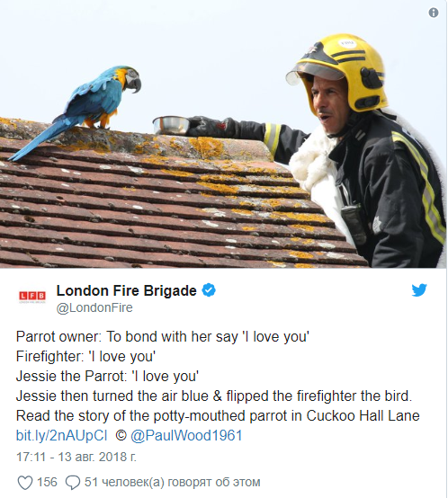 В Лондоне самка попугая по кличке Джесси долго не могла спуститься с крыши дома. Хозяевам пришлось вызвать на помощь пожарных. И когда один из спасателей поднялся к птице по лестнице она ответила ему на приветствие "Я тебя люблю", добавив "Иди на @уй". Об этом сообщает "Медуза" со ссылкой на London Fire Brigade в Twitter.
