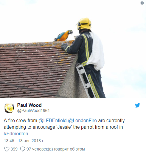 "Иди на @уй". В Лондоне попугай обматерил пожарных, которые приехали снимать его с крыши