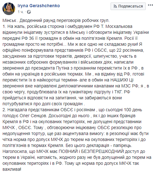 "К сожалению, российская сторона и омбудсвумен РФ Т.Москалькова отвергли инициативу встретиться в Минске и обсудить инициативу Украины о передаче РФ 36 ее граждан в обмен на политзаключенных Кремля", - отметила она.