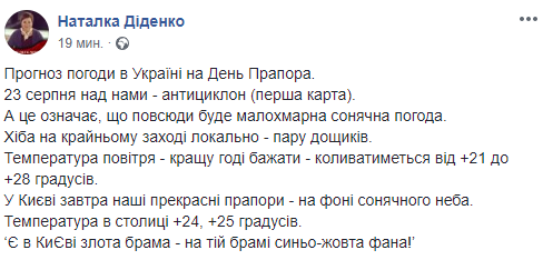 "Температура воздуха - лучшую только желать - будет колебаться от +21 до +28 градусов. В Киеве завтра наши прекрасные флаги поднимут на фоне солнечного неба. Температура в столице установится на отметке в +24, +25 градусов", - сообщила Диденко.