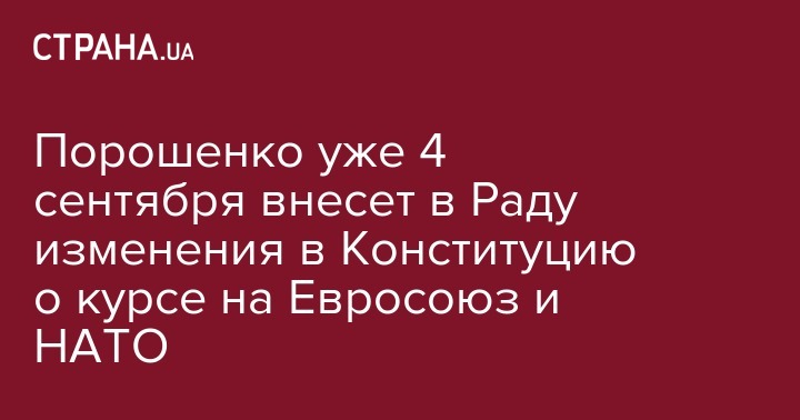 Президент Петр Порошенко заявил, что 4 сентября, до начала девятой сессии, внесет в Верховную Раду закон об изменениях в Конституцию о курсе Украины на ЕС и НАТО. Об этом Порошенко заявил перед началом парада по случаю 27-летия независимости Украины.