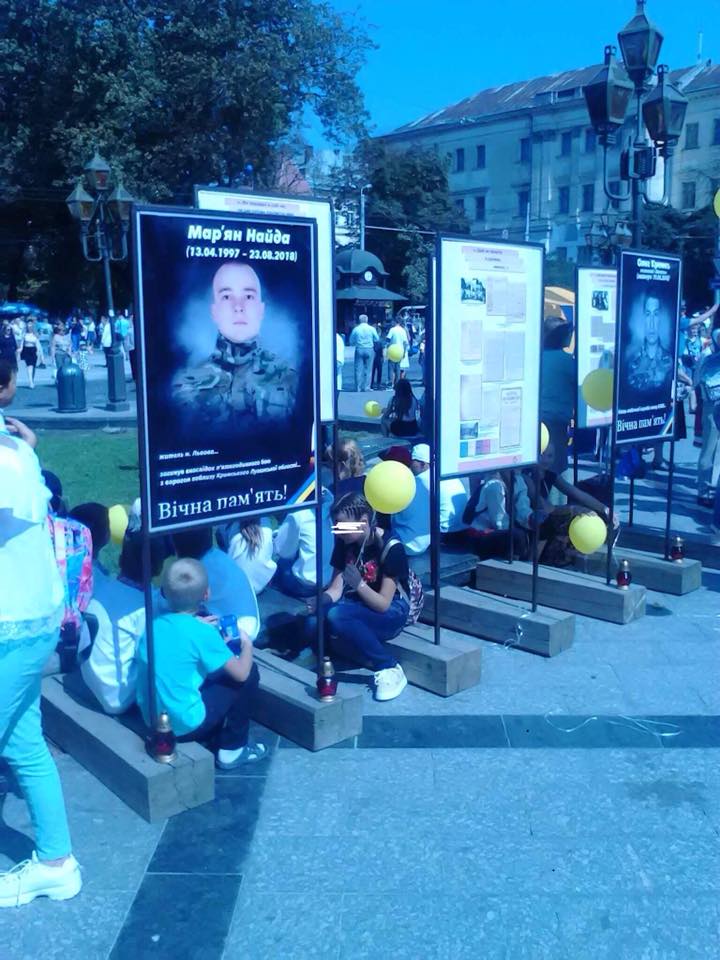 Некоторые дети сумели укрыться от солнца в тени стенда с изображением погибшего героя Майдана Марьяна Найды.
