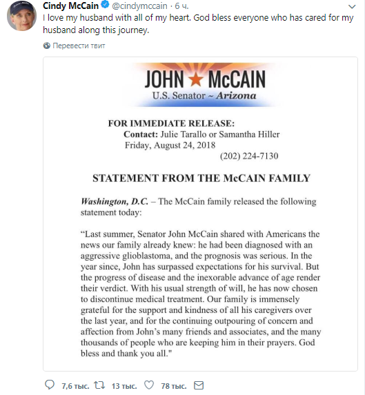Супруга американского сенатора от Республиканской партии Джона Маккейна Синди прокомментировала его решение о прекращении лечения опухоли мозга, диагностированной в июле 2017 года. Она поблагодарив всех за помощь на своей странице в Twitter.