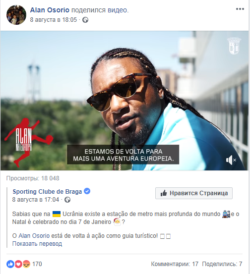 Союз украинцев ​​Португалии обратился требует от ФИФА наказать футболиста ФК "Спортинг Клуб Брага" Алана Озорио. Накануне матча своей команды с "Зарей" он он снялся в видео, где не засчитал Крым в список регионов Украины.