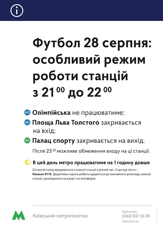 "Особый режим работы станций с 21.00 до 22.00. "Олимпийская" работать не будет; "Площадь Льва Толстого" закрывается на вход; "Дворец спорта" закрывается на выход. После 23.30 возможно ограничение входа на эти станции", - говорится в понедельник, 27 августа, в сообщении, размещенном в соцсети "Фейсбук".