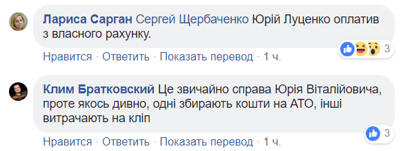 "Это, конечно, дело Юрия Витальевича, но как-то странно – одни собирают деньги на АТО, другие тратят на клип", – ответил Сарган блогер Клим Братковский.