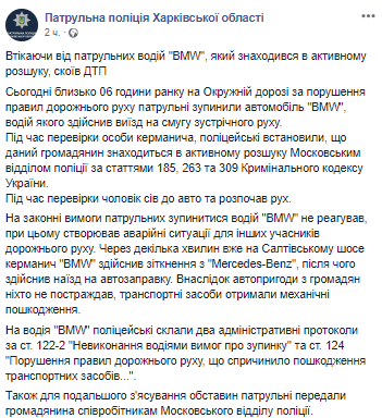 В Харькове при попытке скрыться на авто от полицейских находившийся в розыске мужчина совершил ДТП. Об этом в соцсети сообщила пресс-служба патрульной полиции Харьковской области.