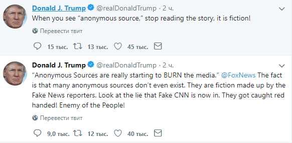 "Дело в том, что многие анонимные источники даже не существуют. Они - выдумка журналистов, пишущих фейковые новости", - утверждает Трамп.
