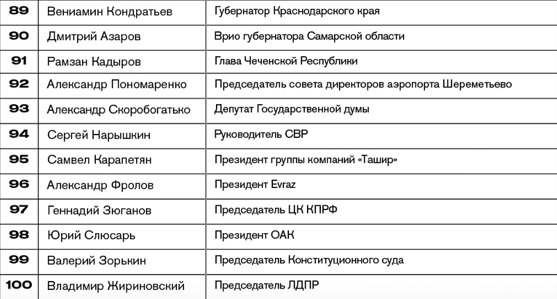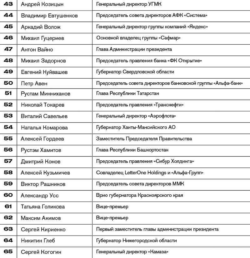 В Топ-10 вошли гендиректор "Сургутнефтегаза" Владимир Богданов, глава Центробанка Эльвира Набиуллина, директор ФСБ Александр Бортников, генеральный директор РЖД Олег Белозеров и президент "Лукойла" Вагит Алекперов.