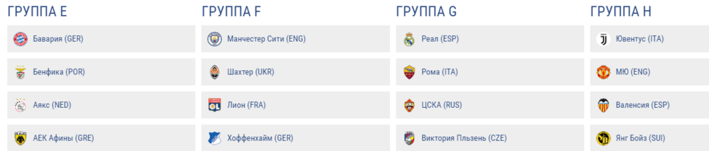 | Группа А | Группа В | Группа C | Группа D | Группа E | Группа F | Группа G | Группа H |