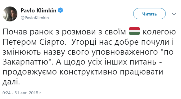 "Начал утро с разговора со своим венгерским коллегой Петером Сийярто. Венгры нас хорошо услышали и меняют название своего уполномоченного "по Закарпатью". А по всем остальным вопросам - продолжаем конструктивно работать дальше", - написал Климкин.
