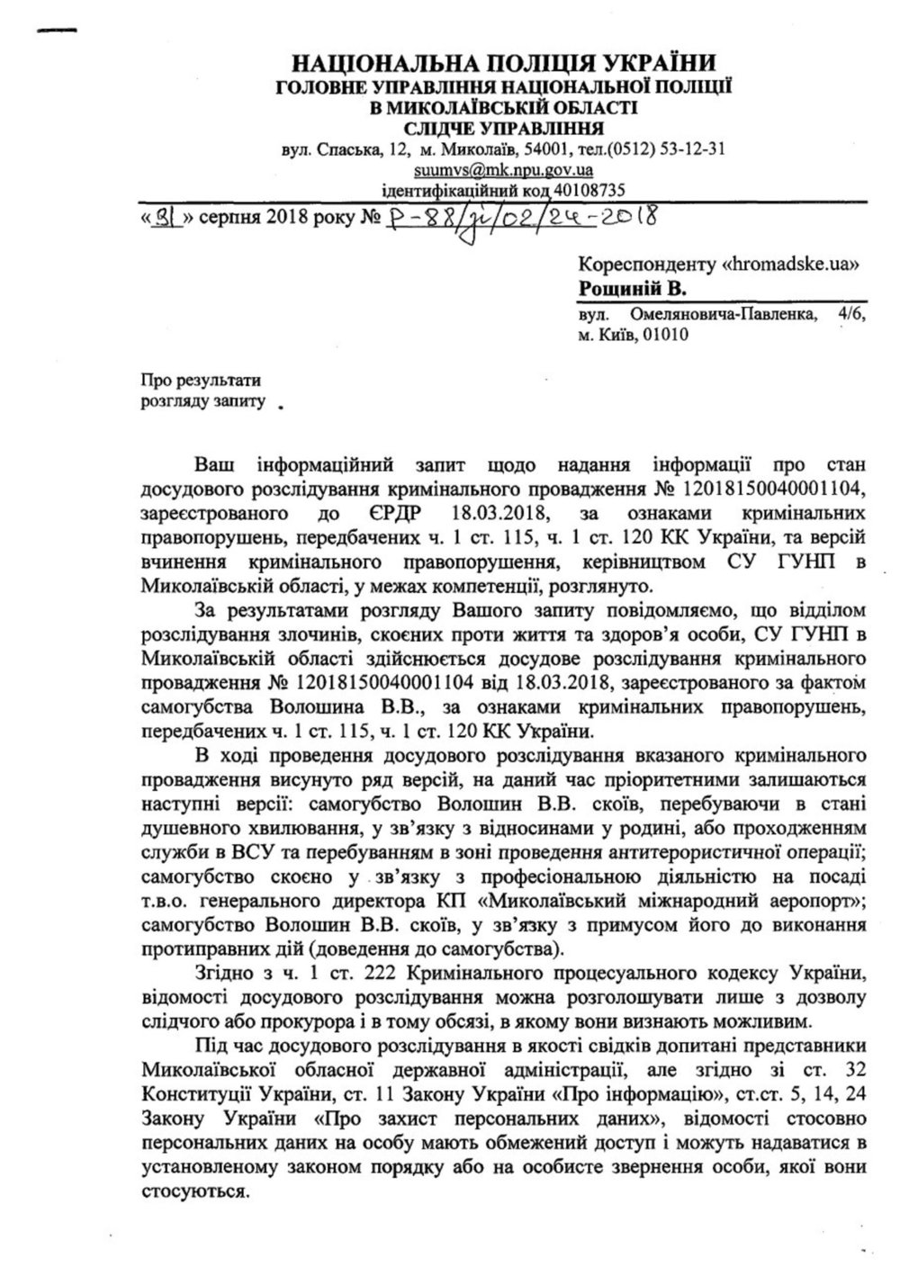 Напомним, глава полиции Николаевской области покинул пост во время расследования суицида Волошина.
