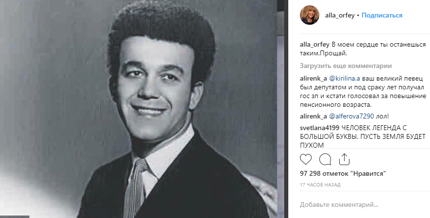 "В моем сердце ты останешься таким. Прощай", – написала Пугачева в соцсети и показала фото молодого Кобзона.