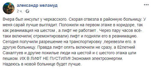 "Вчера был инсульт у Черкасского. Скорая отвезла в районную больницу. У меня сарай лучше выглядит. Положили на первом этаже в коридоре, так как реанимация на шестом, а лифт не работает. Через пару часов все-таки включили (отремонтировали) лифт и подняли его в реанимацию. Сегодня получили разрешение на транспортировку, перевезли его в другую больницу. Правда лифт опять включили не сразу, а 82-летний Сахалтуев и другие пожилые люди на шестой и с шестого этажа шли пешком. ИХ В ЛИФТ НЕ ПУСТИЛИ! Экономия электроэнергии", - написал он.