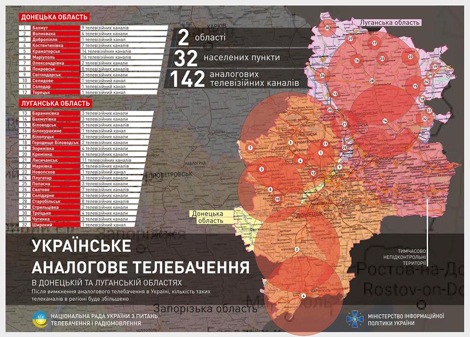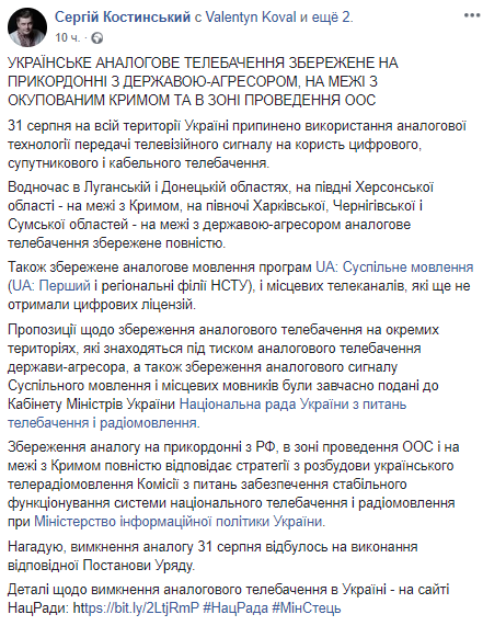Украинское аналоговое телевидение продолжает работать в Луганской и Донецкой областях, на границе с Крымом и с Российской Федерацией. Об этом сообщил член Национального совета по вопросам телевидения и радиовещания Сергей Костинский на своей странице в Facebook.