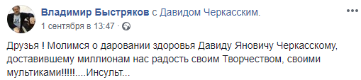 "Молимся о даровании здоровья Давиду Яновичу Черкасскому, доставившему миллионам нас радость своим Творчеством, своими мультиками!!!!!....Инсульт...", - написал он.