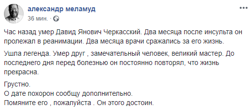 "Час назад умер Давид Янович Черкасский. Два месяца после инсульта он пролежал в реанимации. Два месяца врачи сражались за его жизнь.