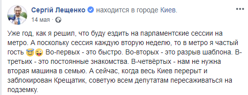 В киевской подземке сфотографировался и нардеп Сергей Лещенко. Он сообщил, что уже год ездит на заседания в Раду на общественном транспорте и посоветовал всем депутатам последовать его примеру.