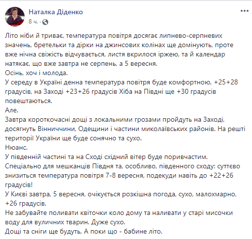 Как сообщила синоптик Наталья Диденко на своей странице в Facebook, дневная температура воздуха будет комфортной, +25 +28 градусов, на западе +23 +26 градусов, на юге +30.