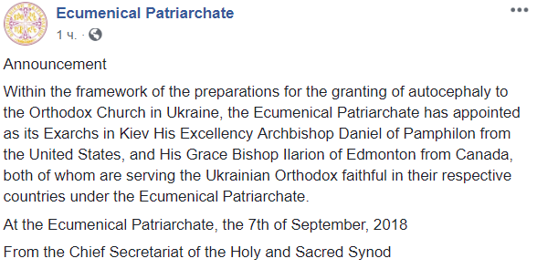 "В рамках подготовки к предоставлению автокефалии Православной Церкви в Украине Вселенский Патриархат назначил как своих экзархов в Киеве Его Преосвященство Архиепископа Даниила Памфилийского из Соединенных Штатов и Его Преосвященство епископа Илариона Эдмонтонского из Канады которые оба служат украинским православным верным в своих странах во Вселенском патриархате".