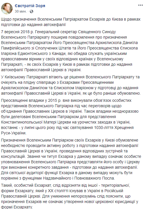 "Такой, личный экзархат, следует отличать от другой - территориальной, формы Экзархата, который в ХХ веке существовал в Украине в Русской Православной Церкви. Во избежание недоразумений следует объяснить, что назначение экзархом не означает образования новой церковной юрисдикции в форме Экзархата", - заявил Зоря у себя в Facebook.