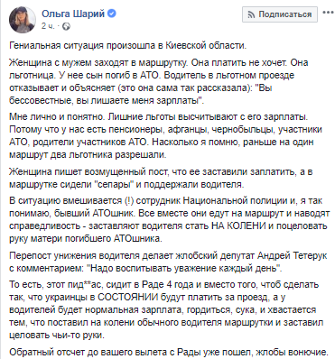"В ситуацию вмешивается (!) сотрудник Национальной полиции и, я так понимаю, бывший АТОшник. Все вместе они едут на маршрут и наводят справедливость - заставляют водителя стать НА КОЛЕНИ и поцеловать руку матери погибшего АТОшника. Перепост унижения водителя делает жлобский депутат Андрей Тетерук с комментарием: "Надо воспитывать уважение каждый день".