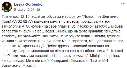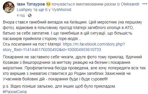 О том, что произошло потом стало известно из поста Ивана Татаурова (в его профиле указано, что он работает в Нацполиции): "Вчера произошел позорный случай на Киевщине. Этот мерзавец (водитель, – Ред.) отказал в льготном проезде матери погибшего парня в АТО. Что позорно в этой ситуации, большинство пассажиров приняли сторону горе-водителя. Наказание не заставило себя ждать. Благодарен казакам с Вышгородщины за мгновенную реакцию и наказание мерзавца", – написал Татауров.