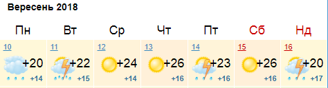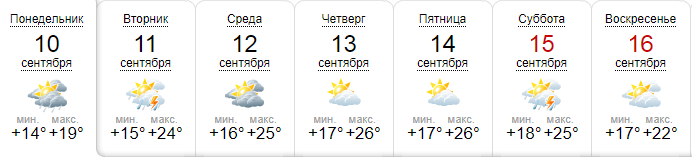 Ресурс Мeteoprog.ua прогнозирует дождь 10 и 11 сентября и температуру до +20. Затем установится сухая погода, потеплеет до +26...+27. Однако с воскресенья температура снизится до +21.