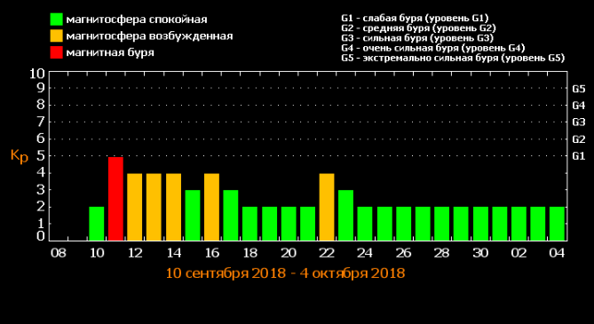По данным Gismeteo, ее пик в Киеве придется на период с 03:00 до 06:00. Геомагнитные возмущения стихнут к 18:00. 12 сентября признаки малой геомагнитной бури могут ощущаться в 06:00 и практически прекратятся к 15:00.