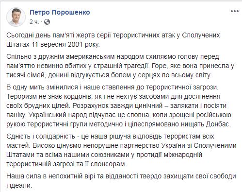 "Сегодня день памяти жертв серии террористических атак в Соединенных Штатах 11 сентября 2001 года. Вместе с дружественным американским народом склоняем голову перед памятью невинно убитых в страшной трагедии. Горе, которое она принесла в тысячи семей, до сих пор отзывается болью в сердцах по всему миру", – заявил Порошенко.