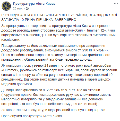 Прокуратура Киева завершила расследование в деле о смертельном ДТП на бульваре Леси Украинки, в результате которого погибла 10-летняя девочка. Об этом сообщает пресс-служба ведомства в Facebook.