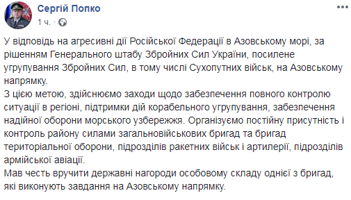 "С этой целью осуществляем меры по обеспечению полного контроля ситуации в регионе, поддержки действий корабельной группировки, обеспечения надежной обороны морского побережья. Организуем постоянное присутствие и контроль района силами общевойсковых бригад и бригад территориальной обороны, подразделений ракетных войск и артиллерии, подразделений армейской авиации", – написал генерал-полковник Попко во вторник вечером.