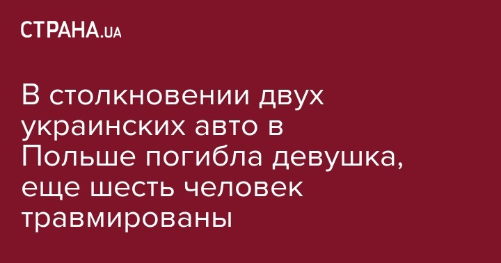 Во вторник, 11 сентября, возле города Томашув-Любельский (Польша) столкнулись два украинских автомобиля, в результате чего 19-летняя девушка погибла, еще шестеро человек получили ранения. Об этом сообщает Dziennik Wschodni.