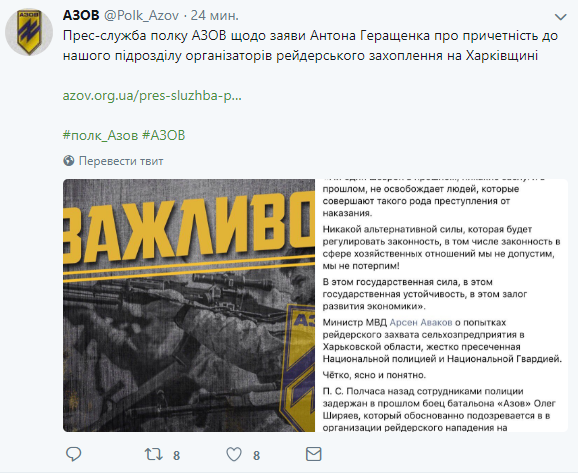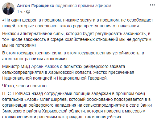 "Полчаса назад сотрудниками полиции задержан в прошлом боец батальона "Азов" Олег Ширяев, который обоснованно подозревается в участии в организации рейдерского нападения на сельхозпредприятие в Занки Змиевского района Харьковской области", - написал Геращенко.