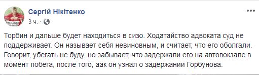 Никитенко сообщил, что Торбин в зале суда называл себя невиновным, и считает, что его оболгали. "Говорит, убегать не буду, но забывает, что задержали его на автовокзале в момент побега, после того, как он узнал о задержании Горбунова", - уточнил журналист.