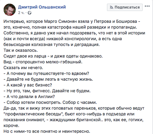 "Интервью, которое Марго Симонян взяла у Петрова и Боширова – это, конечно, полная катастрофа нашей разведки и пропаганды.